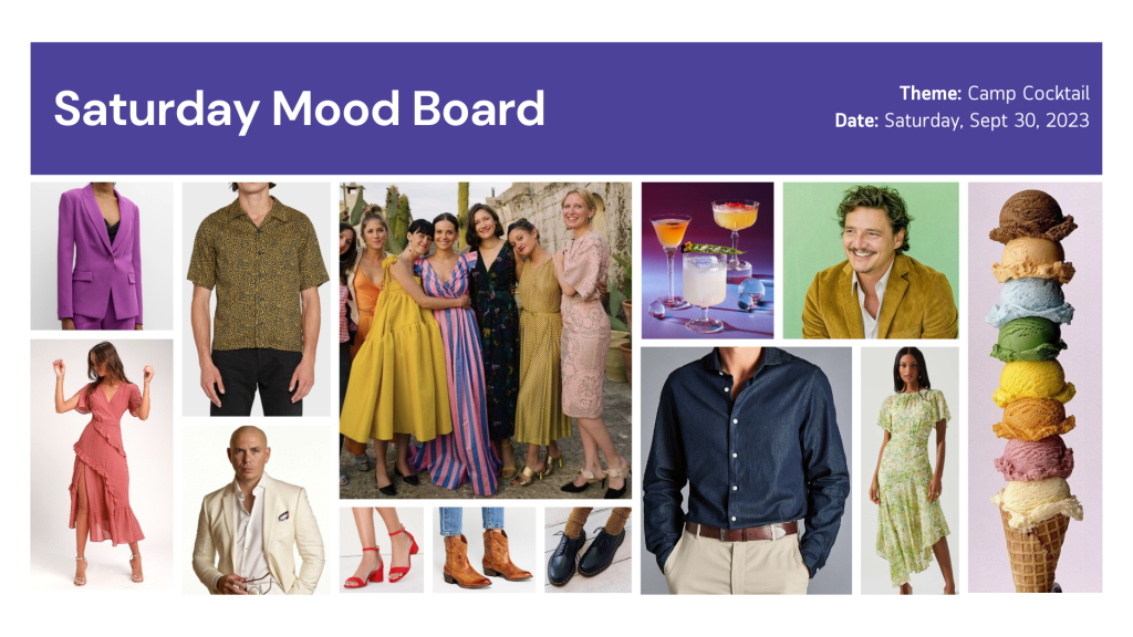 The following mood boards attempt to demonstrate “cowboy casual” and “camp cocktail.”